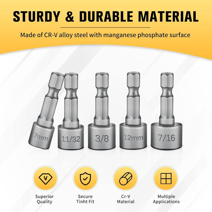 Made of heat-treated CR-V alloy steel with manganese phosphate finish, these nut setters provide superior hardness, wear resistance, and durability for long-lasting use.
