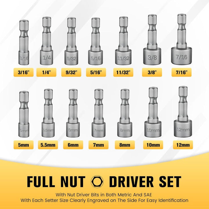 This nut driver set includes 14 essential sizes - 7 metric (5mm, 5.5mm, 6mm, 7mm, 8mm, 10mm, 12mm) and 7 SAE (3/16", 1/4", 9/32", 5/16", 11/32", 3/8", 7/16"). Perfect for daily household repair, woodworking, auto parts, and professional machine work.