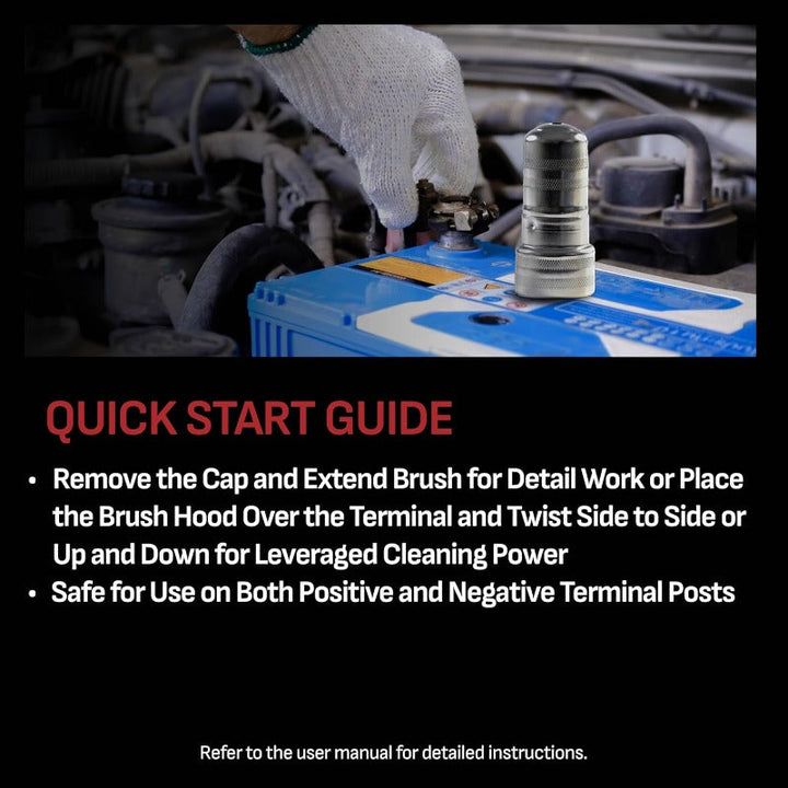 Simply remove the cap, extend the brush for detailed cleaning, or place the hood over the terminal post and twist. Safe to use on both positive and negative terminals.