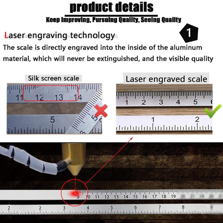 High-contrast laser-etched markings in both metric (mm) and imperial (inch) units stay sharp over time—no fading, no guessing. Designed for precise marking and long-lasting readability.