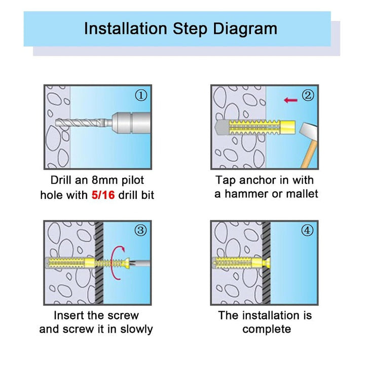 Compatible with concrete walls, brick walls, hollow walls, stucco surfaces, and wood. Ideal for mounting shelves, TV brackets, bathroom grab bars, kitchen organizers, tools, and more.