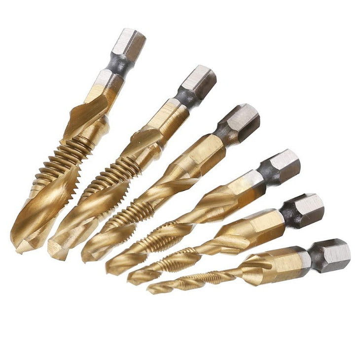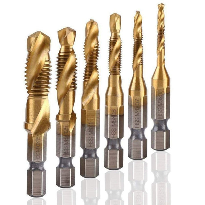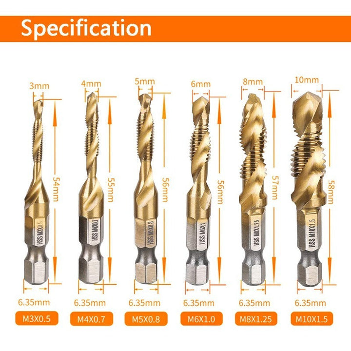6-Piece HSS Titanium-Coated Combo Tap Drill Set — Drill / Tap / Deburr 3-in-1